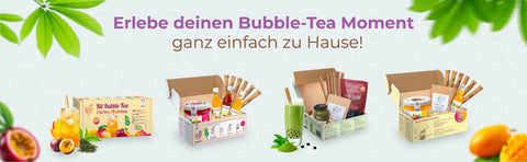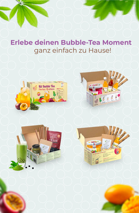 Die Zubereitung von Bubble Tea, auch bekannt als Tee mit Perlen, ist sehr einfach: Sie benötigen Tee, Sirup, Fruchtperlen oder Tapioka-Perlen und einen extragrossen Strohhalm, um alles zu geniessen. Es gibt unzählige hausgemachte Rezepte und endlose Möglichkeiten, Ihren eigenen Bubble Tea zuzubereiten. Um mehr zu erfahren, schauen Sie sich unsere speziellen Artikel an: "Wie man zu Hause Bubble Tea macht" oder "Rezepte für hausgemachten Bubble Tea".